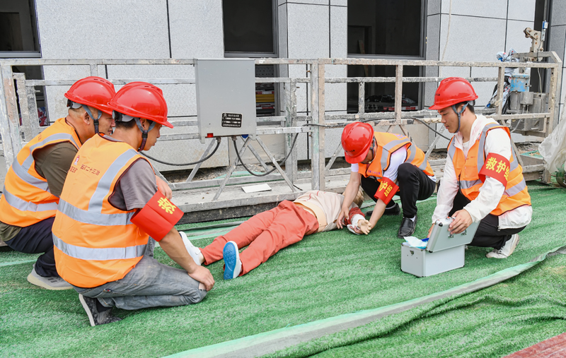 應急演練現(xiàn)場模擬了一名施工人員,在安裝外墻鋁板作業(yè)過程中,因違反安全技術交底要求擅自改變作業(yè)程序,不慎從高處墜落受傷。安全員發(fā)現(xiàn)該情況后,立即上報,隨即應急救援預案迅速啟動,各小組聯(lián)合行動,通過科學有序的救援,及時將傷者送醫(yī)救治,整個演練過程井然有序。通過演練提高了員工應急自救能力,減少高空墜落事故的發(fā)生,并在發(fā)生時能及時有效地進行自救和互救。