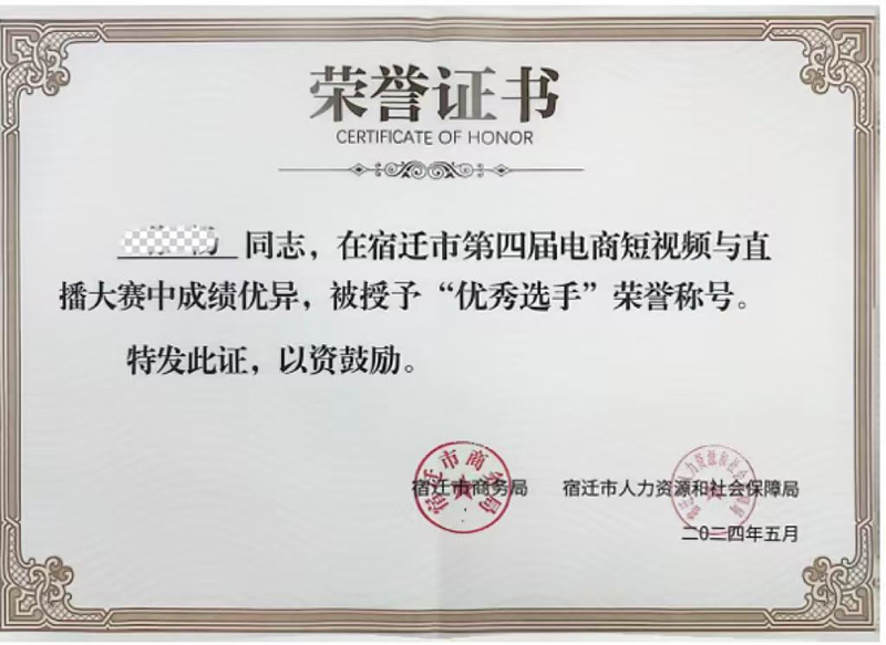 榮譽證書得獲得不僅是對參賽選手個人努力和才華的認可,也是對蘇宿電商園在電商領(lǐng)域?qū)I(yè)人才培養(yǎng)和推動電商直播行業(yè)發(fā)展的成果的肯定。